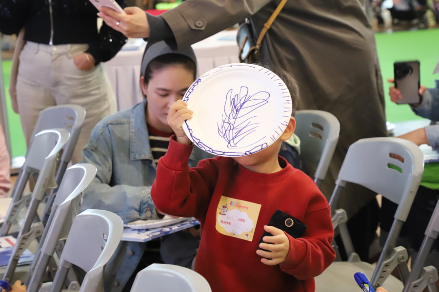 现场小朋友开心地举起自己绘制的青花瓷