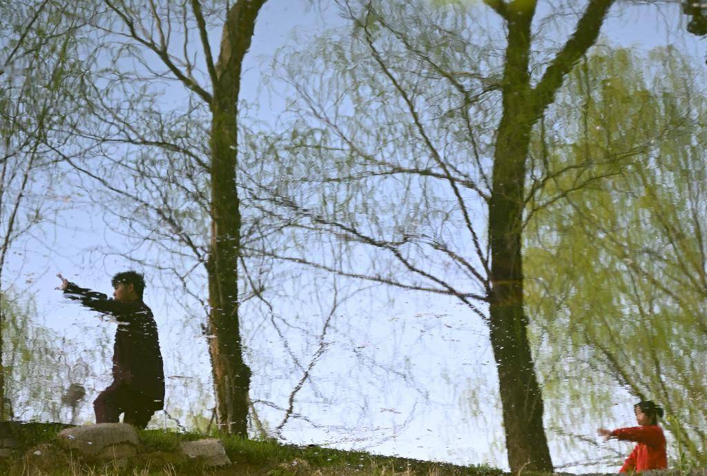 2026年3月19日,在河南省温县陈家沟东沟,太极拳爱好者在练习太极拳(水中倒影,图片经180度旋转)。
