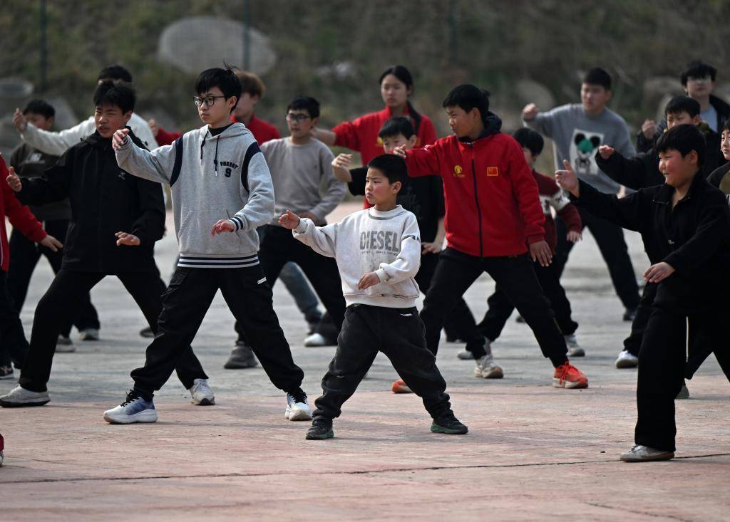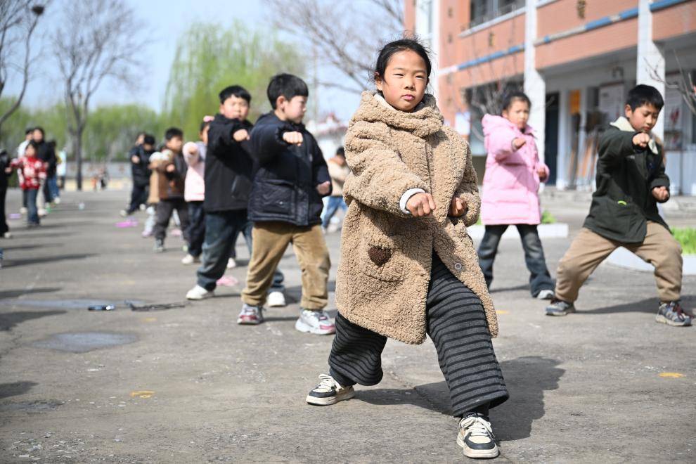 2026年3月18日,温县陈家沟小学的学生在课间打太极拳。