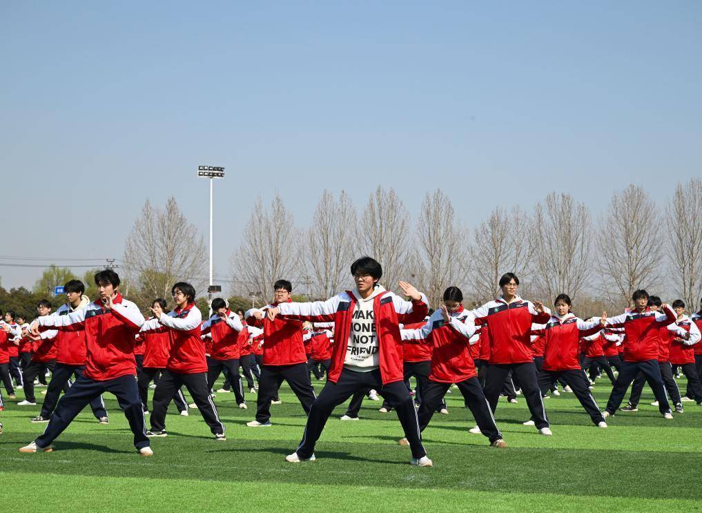 2026年3月20日,在河南省温县第一高级中学,学生在课间操间隙练习太极拳。