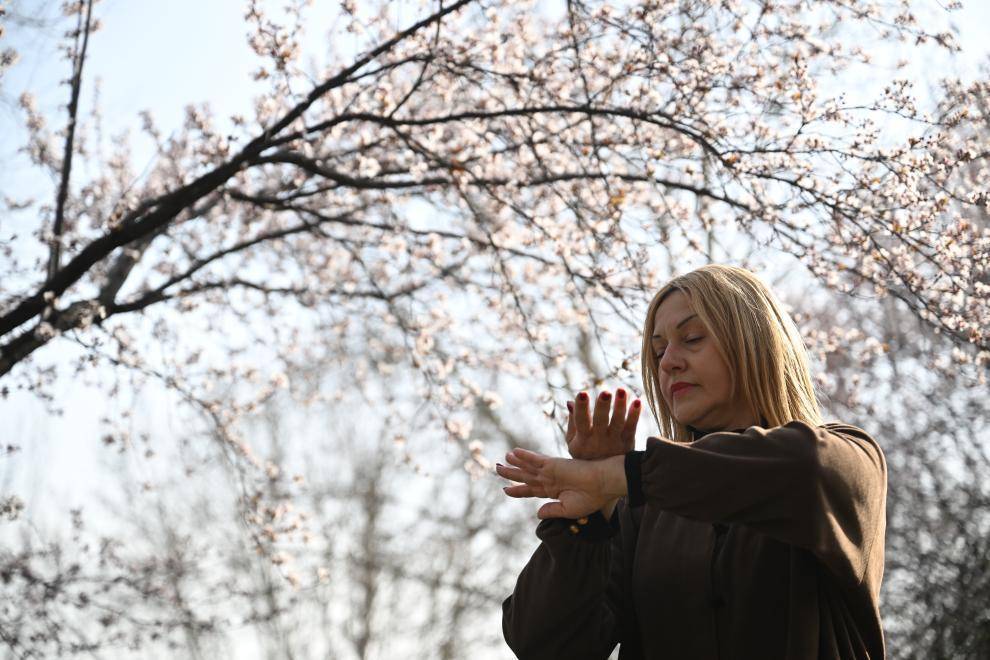 2026年3月19日,来自俄罗斯的伊莉娜在河南省焦作市温县陈家沟太极十三式雕塑广场练习太极拳。