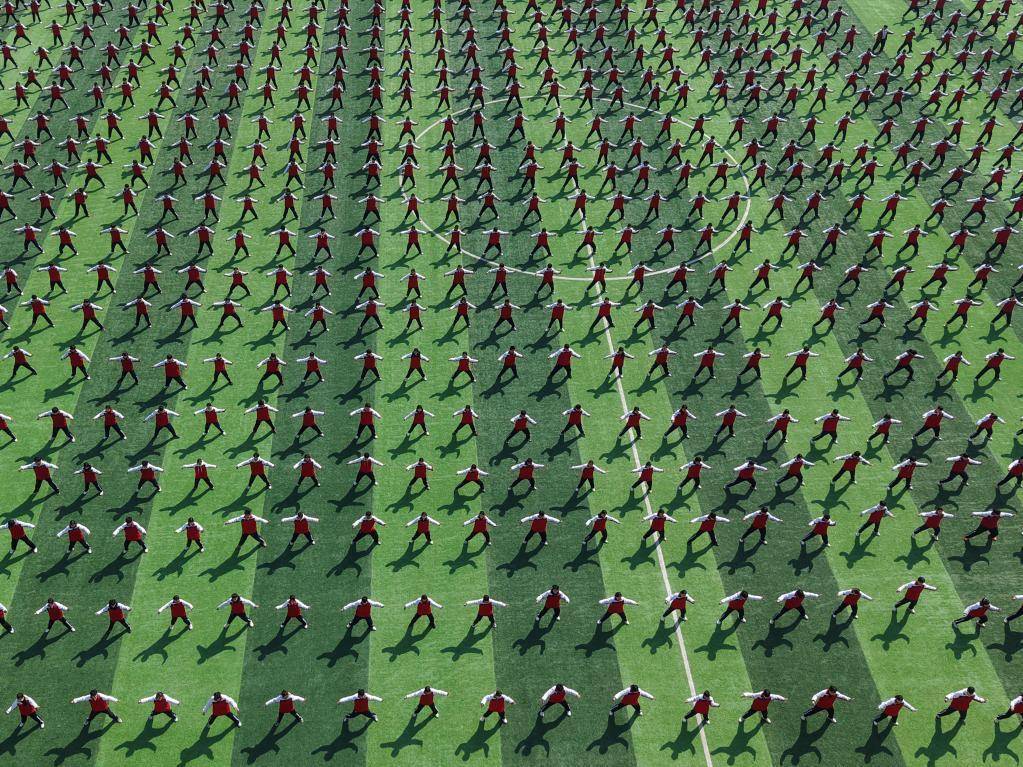 2026年3月20日,河南省焦作市温县一中学生在课间操时间集体习练太极拳(无人机照片)。