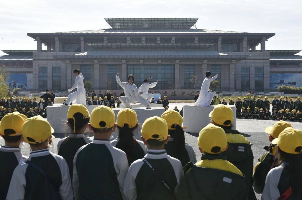 河南省郑州市金水区文源小学师生近400人来到太极拳的发源地——河南温县陈家沟,开展“领略传统武术 感悟非遗文化”研学实践活动(2023年12月8日摄)。