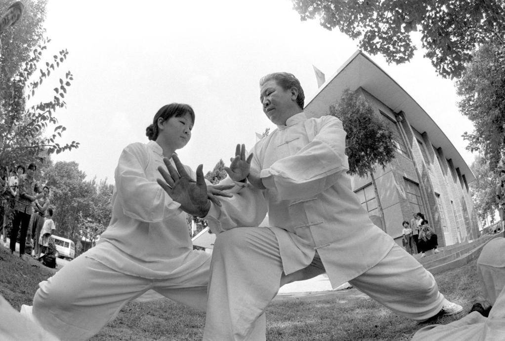 1994年,陈家沟村太极武馆总教练、陈式太极拳十九代传人陈春雷(右)正在与学员演练太极推手功。