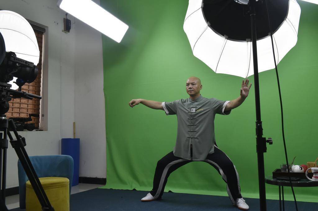 太极拳传人王战军在河南温县陈家沟自己的武校直播间内,通过网络直播推广太极拳(2023年9月15日摄)。