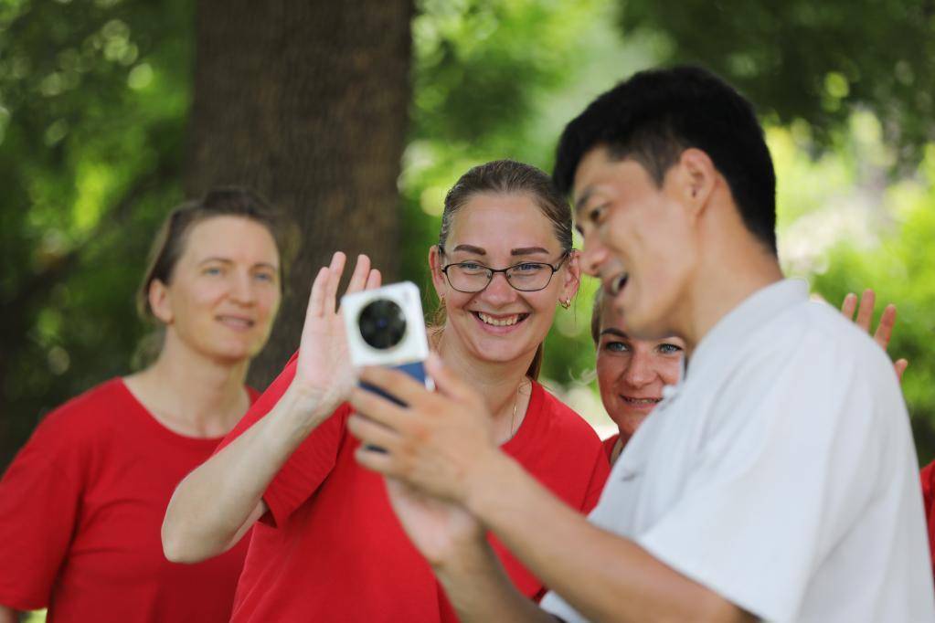 在河南省焦作市温县陈家沟,太极拳师郑赢全和拉脱维亚学员分享交流(2025年8月16日摄)。