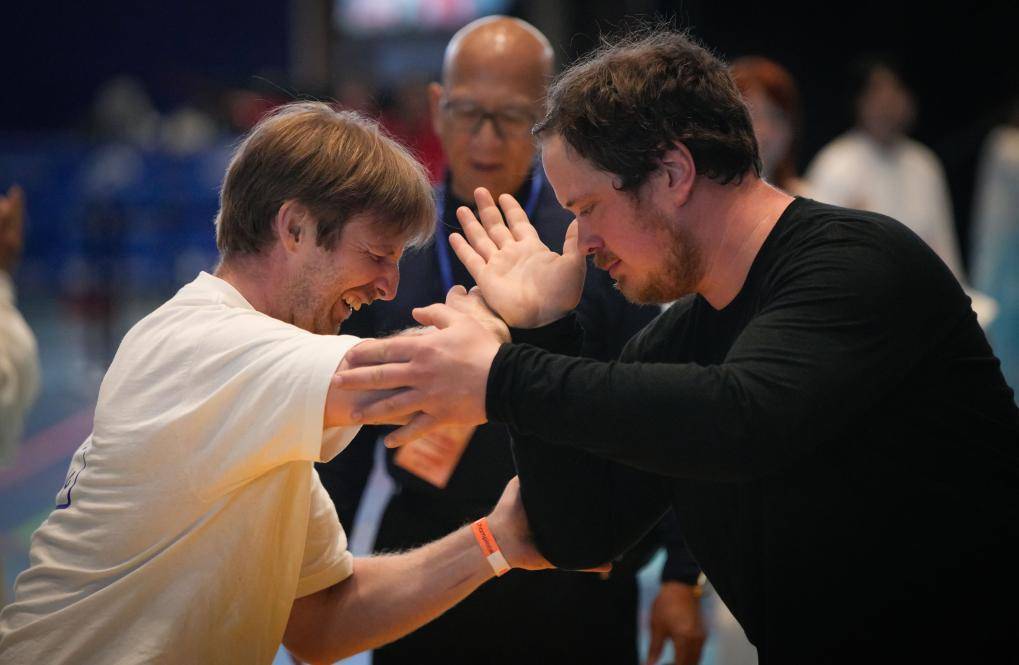 在加拿大温哥华,两名选手在第42届加美国际武术锦标赛太极推手项目比赛中(2024年6月15日摄)。