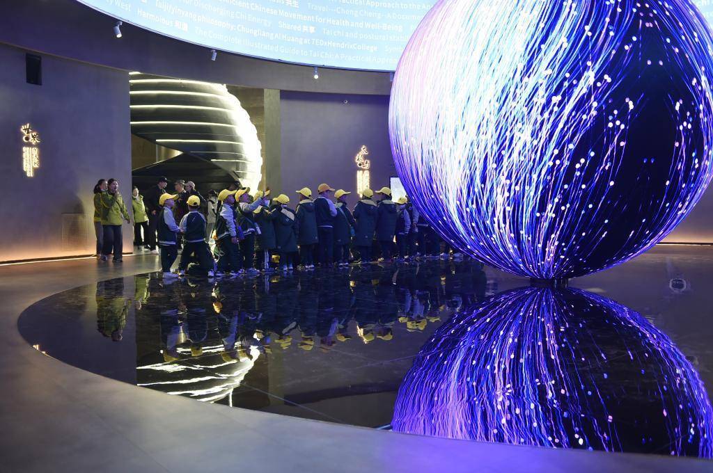 学生们在温县陈家沟的太极全域剧场内参观“万象·太极”科技互动展馆(2023年12月8日摄)。